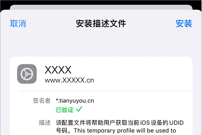 描述文件是经过苹果公司认证的,用来记录用户唯一标识的文件。通过安装描述文件,我们能获得您的设备标识,是安装APP的必备条件。